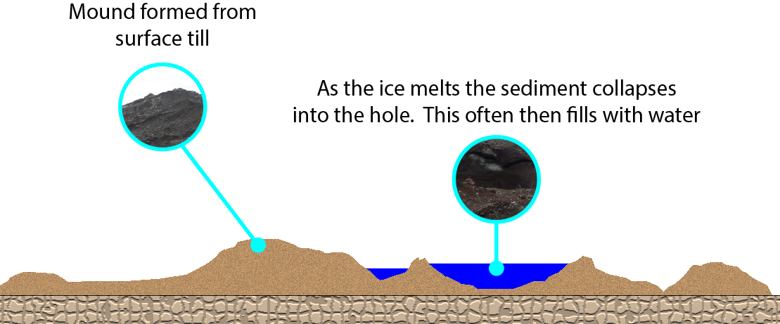 No discussion of Shropshire’s glacial history would be complete without talking about the mosses & meres that are dotted all over the northern half of the county. Many of these are kettle holes, a glacial landform created when chunks of ice break off from a retreating glacier and get covered in sediment. Later this ice melts, leaving a depression behind in the ground that then gets filled in by water. Lakes such as Blake Mere, Cole Mere, Crose Mere and the largest of them all, Ellesmere are all kettle holes; the relics of a dying glacier.