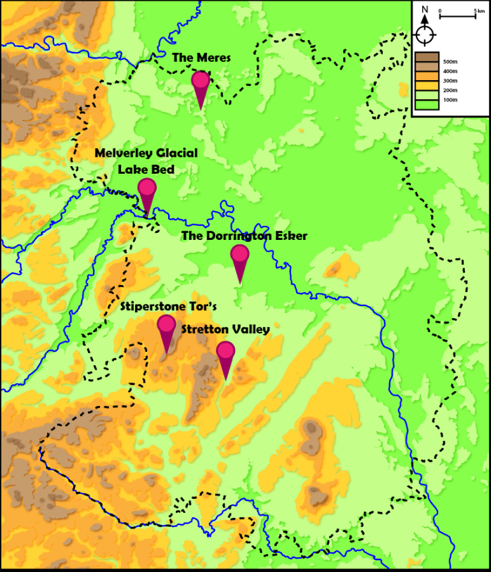 The Quaternary Period started 2.6 million years ago and has lasted until the present day (though this is debatable in connection with the concept of the Anthropocene). The Quaternary is divided into two Epochs; the Pleistocene and the Holocene. The Pleistocene is often referred to as the ‘Ice Age’, though this is a bit of a misnomer. There are four recorded glacial advances in Britain’s Pleistocene; the Beestonian (>866ka), the Anglian (478-424ka), the Wolostonian (352-130ka) and the Devensian (115-11.7ka). Being the most recent, the Devensian Glaciation is the best represented in Shropshire, having helped shape the landscape that we see today. Keep reading to see some of the landforms left by this age of ice.